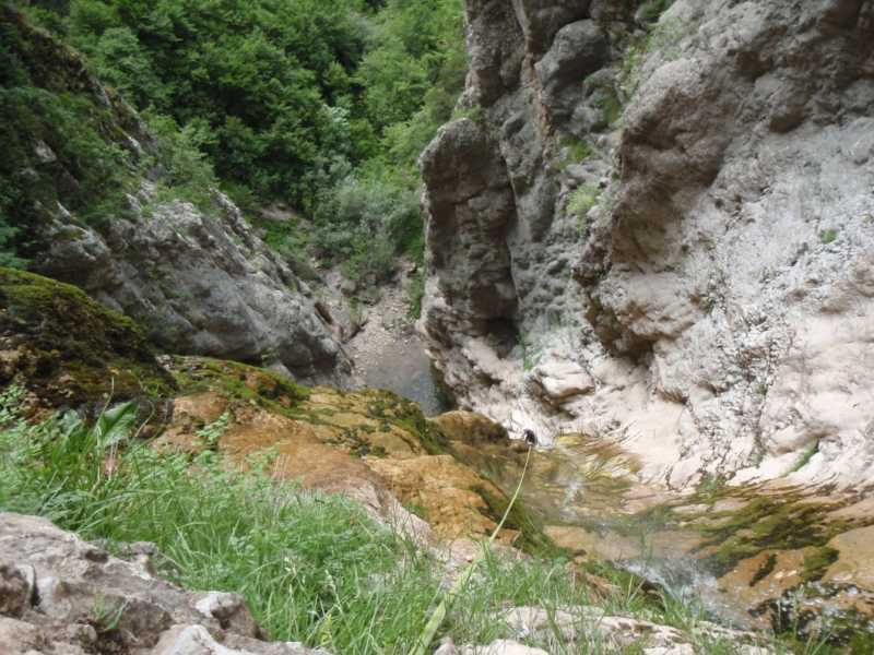Η πρώτη κάθοδος είναι μία τσουλήθρα 8 μέτρων και από κει και πέρα το φαράγγι σε βάζει γρήγορα στον ρυθμό του, τα ραπέλ είναι συνεχόμενα, χωρίς τεχνικές δυσκολίες, η βλάστηση πολύ πλούσια και άγρια. Τα ραπέλ μέχρι το τέλος είναι διαδοχικά και ξεκινάνε από 30, 14, 13, 9, 6, 41 καταλήγοντας στον μεγάλο 85 μέτρων, τον οποίο μοιράσαμε στα 10, 48 και 36.